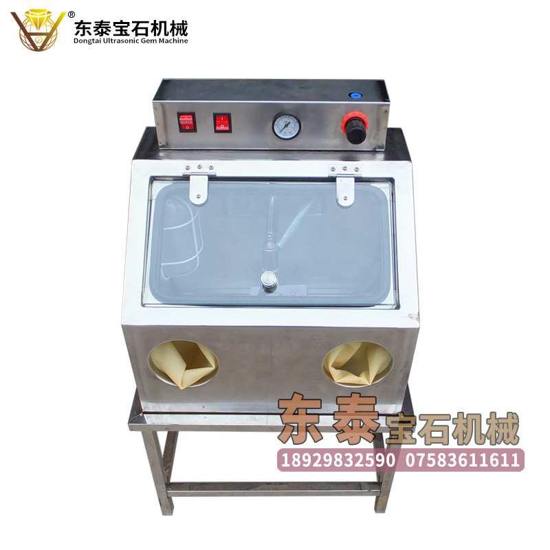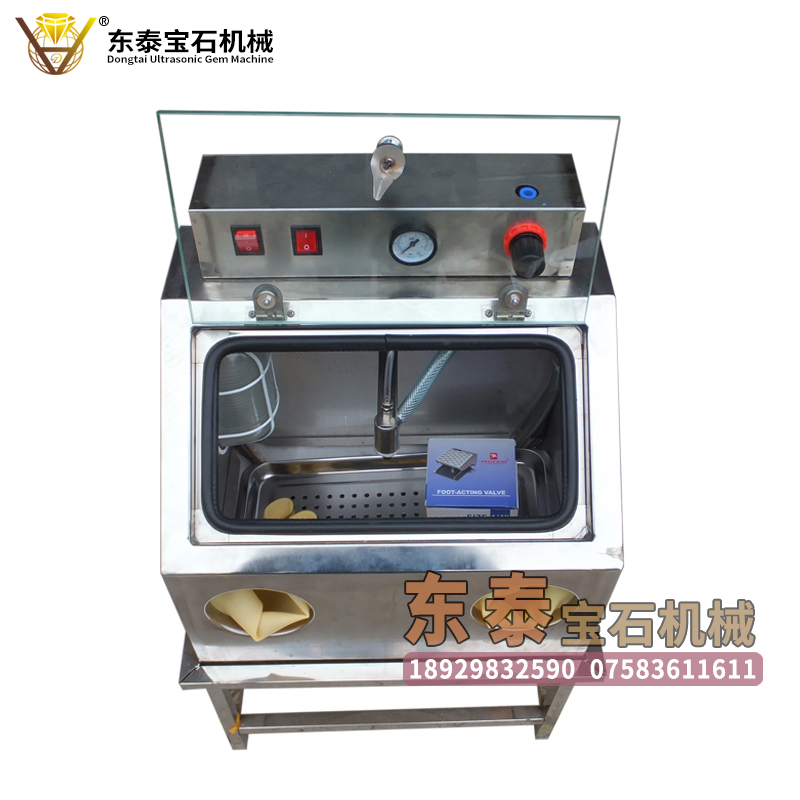 除尘风机:220V/550W 调压阀:SNS 4分 电磁阀:SNS 4分全铜,耐气压为12KG 电压表:(SAS)全不锈钢,耐压10KG 高压气管:耐磨材料,耐气压为12KG 硼砂枪:碳化硼喷嘴,抗高压耐磨 照明灯:节能灯220V/60W 功能:东泰超声波宝石机械生产的喷砂机,主要用来对宝石产品表面进行打磨处理,把宝石产品表面处理光滑和带有磨砂效果,操作简单,使用方便。