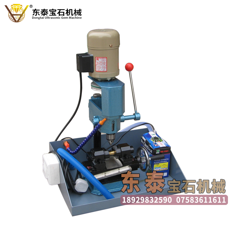 功能:东泰超声波宝石机械生产的台钻打孔机,可以用于高硬度的玉石圆珠进行钻孔,自带夹具,打孔精度高,可单向或双向打孔,转速为调节皮带轮进行调速,电机力度大,加工速度快,适用范围广,操作简便。打孔深度为0MM—20MM,使用改装过的夹头可以打圆珠、米珠类产品。